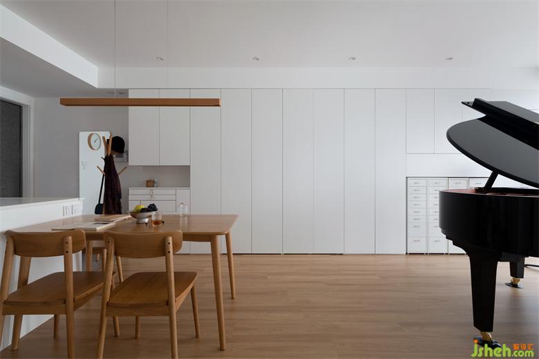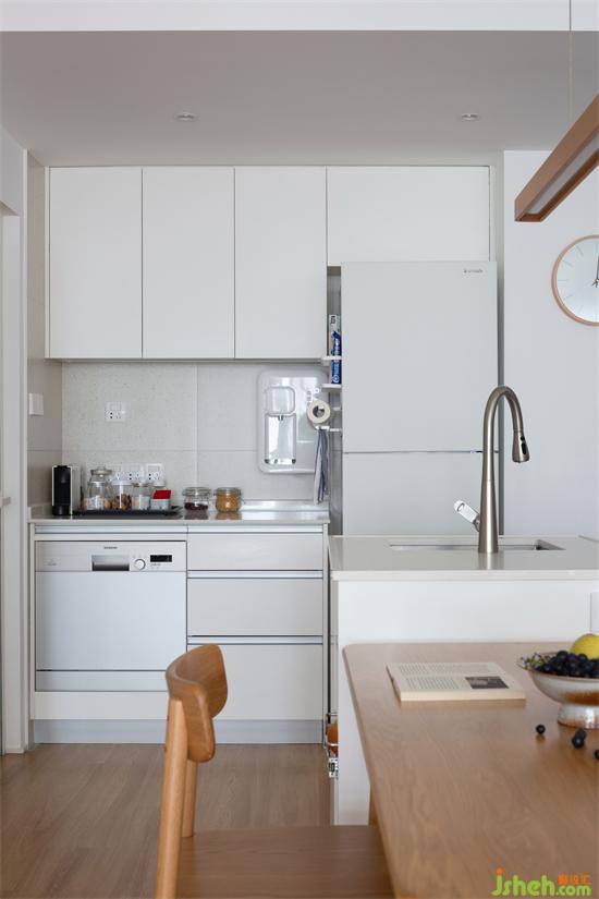 備菜、烹飪在內(nèi)廚進(jìn)行,冰箱、咖啡飲品、煲飯、飲水、餐具水果清洗的功能則轉(zhuǎn)移到外廚及餐廳處,抵消廚房空間不足帶來的不便。