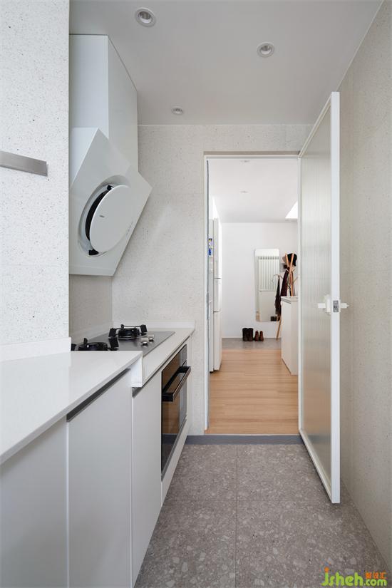 屋主愛好烹飪,休息日一般自己在家做飯。廚房寬度不夠,舊房改造因此只做了一邊櫥柜,拐角處做了三角形的櫥柜。