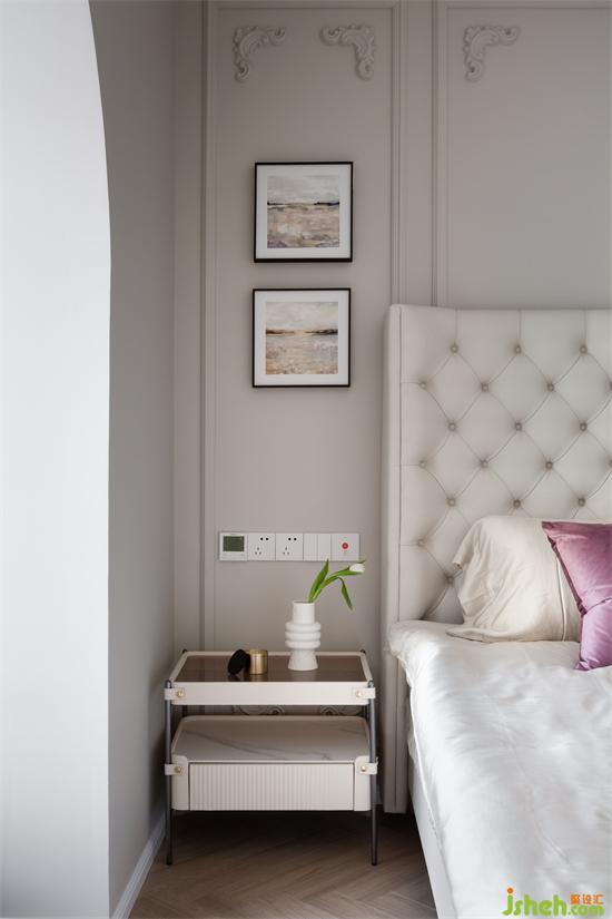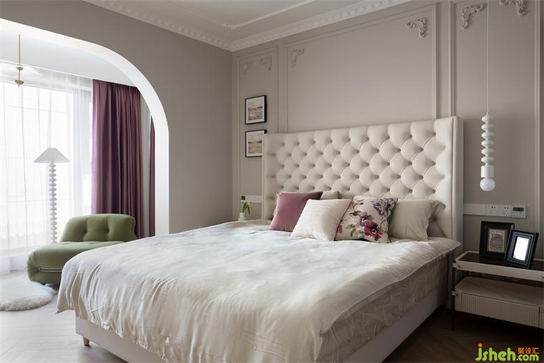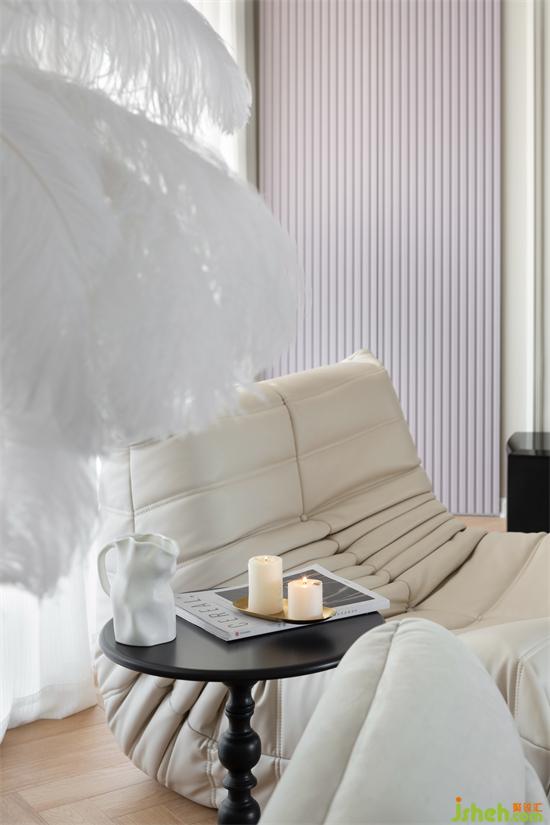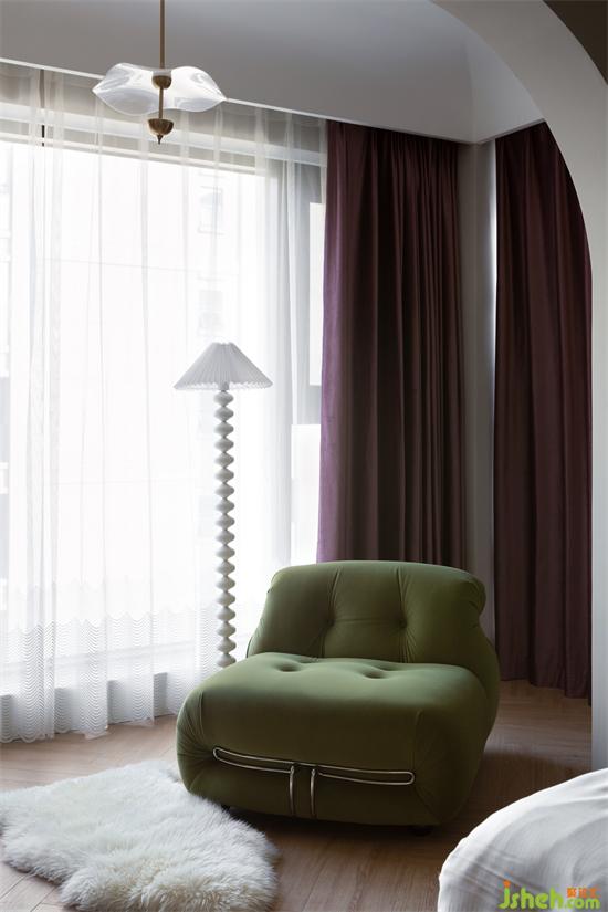 淡雅的白色,配合法式軟包床,給臥室戴上了奶油慕斯般的濾鏡,裝修設(shè)計綠色鋼牙沙發(fā)和紫色窗幔又十分搭調(diào)地為空間注入亮色。