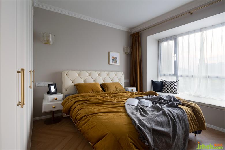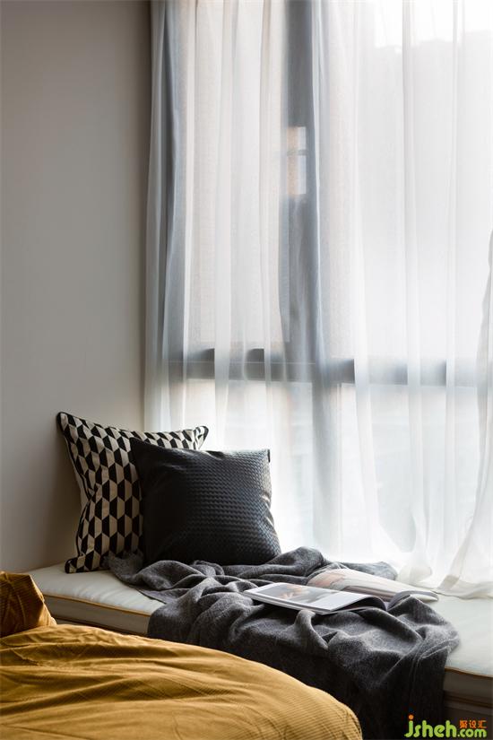 次臥為家里老人居住,墻漆、床品都選擇了簡(jiǎn)約穩(wěn)重的顏色。紗簾與布簾分布于飄窗內(nèi)外,更方便老人行動(dòng)。