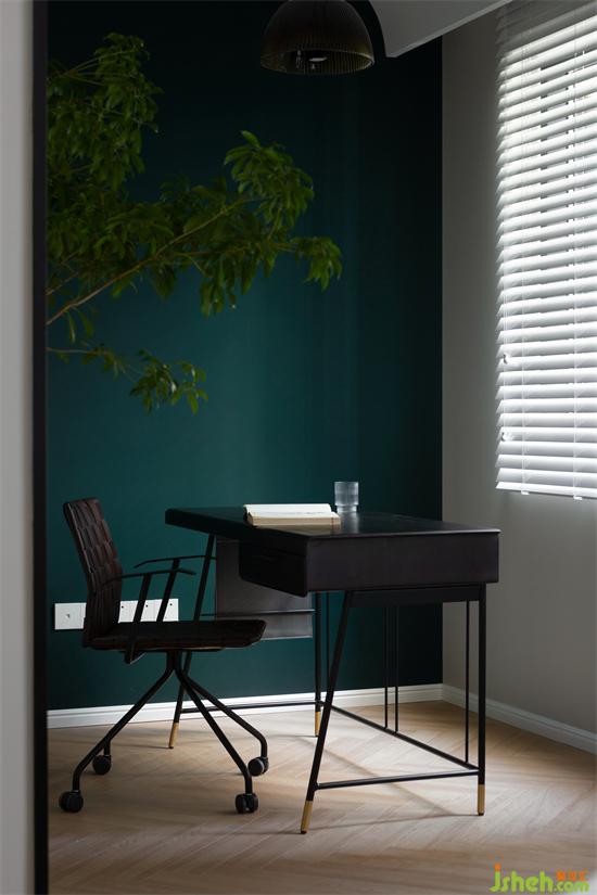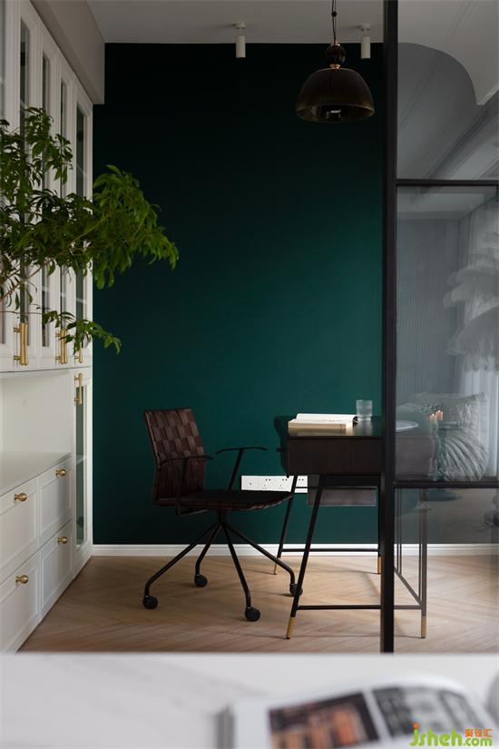 墨綠色墻漆,與墨綠色吊燈呼應(yīng),讓進(jìn)入書(shū)房的人瞬間沉靜下來(lái)。