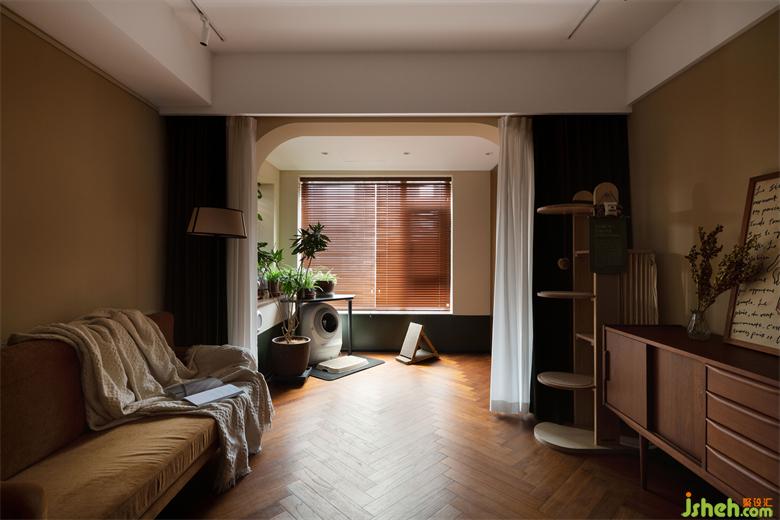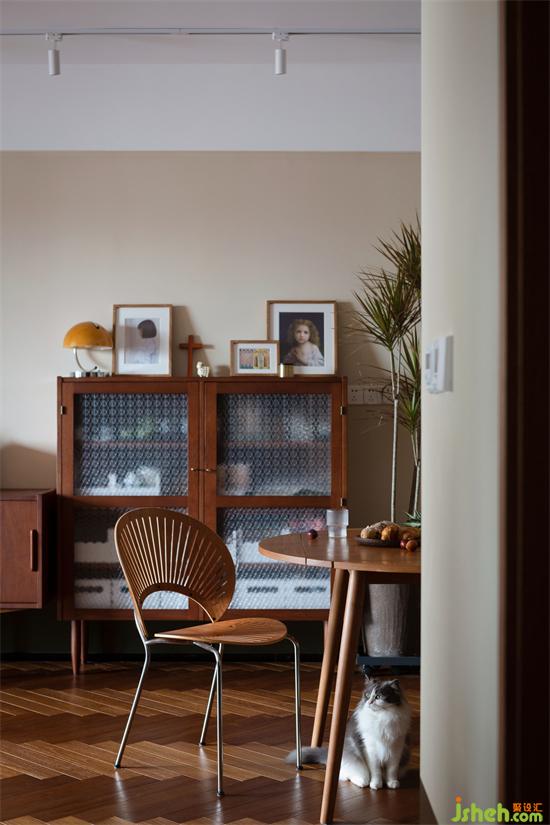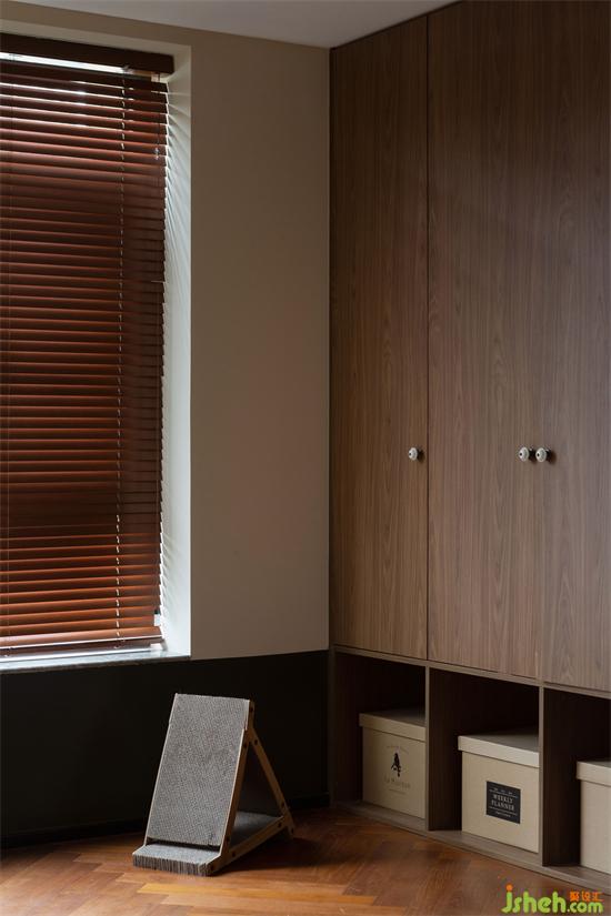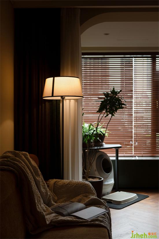 光線透過木質(zhì)百葉窗簾,家裝設(shè)計在家里映射出斑駁光影,像是一張被珍藏到畫面泛黃的老照片,保留住每一刻的滿滿回憶。除了產(chǎn)生回憶,陽臺還是照料寵物們的地方,寵物廁所、貓抓板等等一應(yīng)俱全。