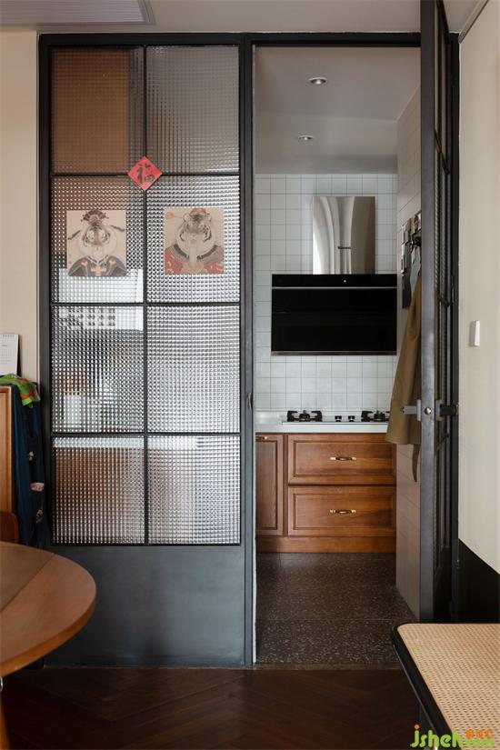 廚房里復(fù)刻了舊時代常見的小方磚,雙方格壓花玻璃以及傳統(tǒng)色系的水磨石,家裝設(shè)計這些舊元素以新的搭配形式展現(xiàn),還原媽媽熟悉的煙火氣。
