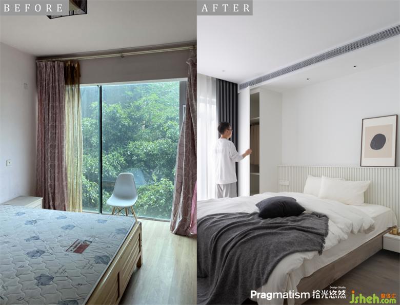 主臥與客廳之間的墻面,依照著頂面的屋梁重新砌筑,最大限度弱化屋梁的突兀感。