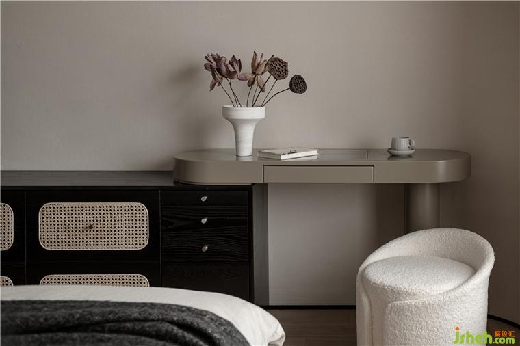 主臥延續(xù)整體空間設(shè)計(jì)的自然樸素質(zhì)感。應(yīng)對(duì)屋主的梳妝和儲(chǔ)物需求,在床尾特別設(shè)計(jì)了斗柜+梳妝臺(tái)的整體成品家具,成都香悅府裝修設(shè)計(jì)將空間的尺度把握得恰到好處。