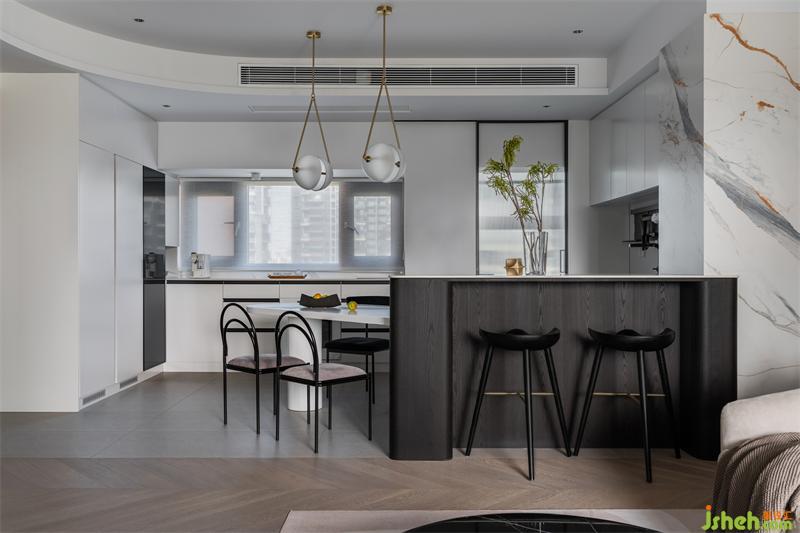 藝術(shù)家設(shè)計餐桌通過45度左右的柔性斜角處理,不但可以解決入戶餐桌的不好放置的問題, 還能確??蛷d的全景觀和采光度。一臺兩用,即可以作為島臺使用,也可以作為水吧臺使用