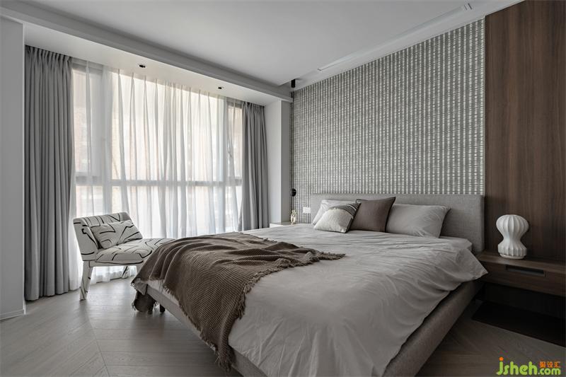 床頭部分不完全的“統(tǒng)一”。木飾面縱向延伸柜子的長度,從而拉長空間的線條感,而橫向效果又能起到美化的裝飾作用和擴(kuò)寬空間整體的尺度感。