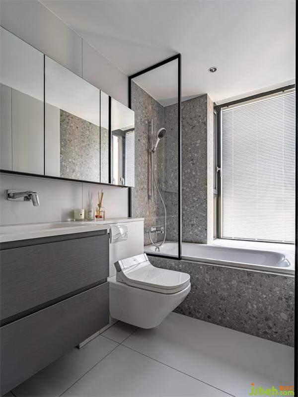 主衛(wèi)和公衛(wèi)都同樣采用了大面積的鏡面玻璃,這樣可以使空間整體的光感更加通透,黑色的柜體和灰色大理石相互搭配就是高級(jí)感的范本。