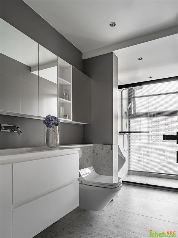 藝術(shù)家設(shè)計(jì)把原本生活陽臺(tái)的面積納入到了公衛(wèi),多出來的部分剛好做一個(gè)小便斗,這樣既舒適又衛(wèi)生。當(dāng)然儲(chǔ)物收納也是必不可少,洗手臺(tái)的上下方都設(shè)計(jì)了儲(chǔ)物柜。