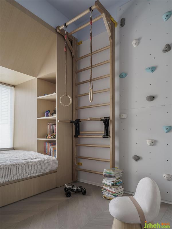 床尾設(shè)計(jì)了衣柜和儲(chǔ)物格,這樣很便于小朋友自己整理衣物和物品,取放都很方便。