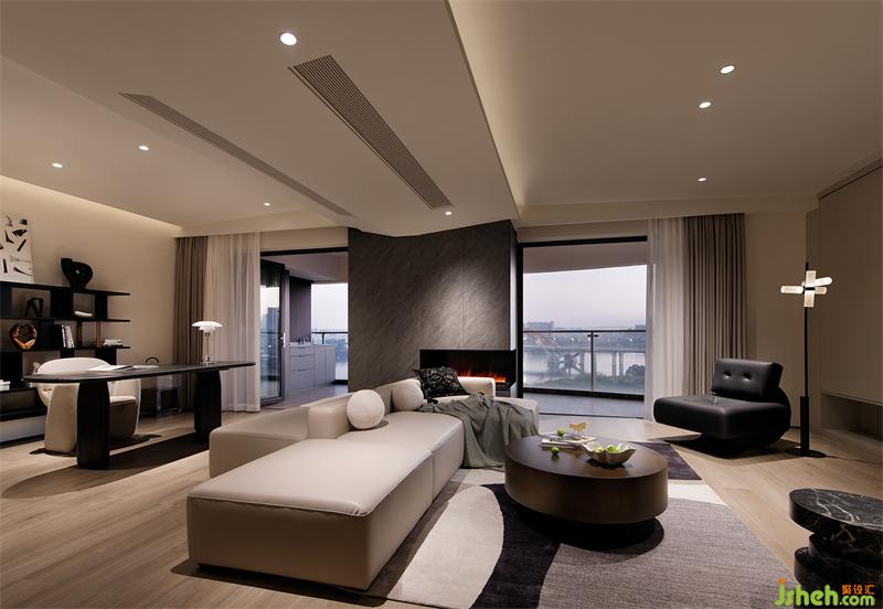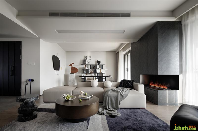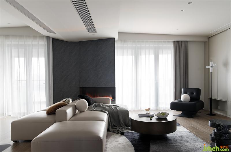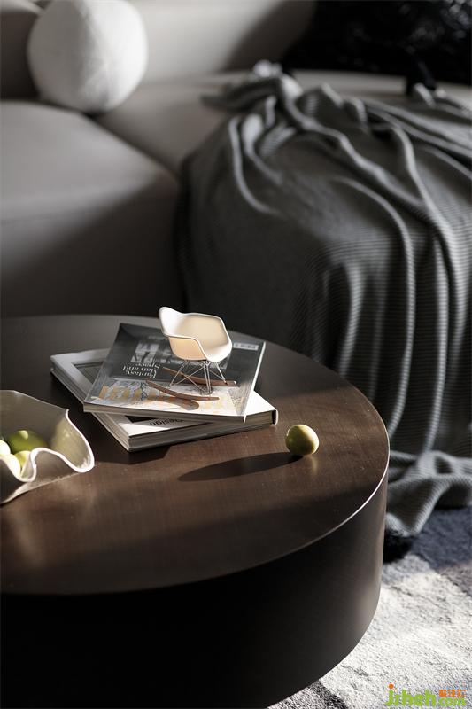 沉穩(wěn)厚重的煙熏色茶幾與高級(jí)灰絨面地毯結(jié)合,為整個(gè)客廳鋪墊一層溫馨的基調(diào)。