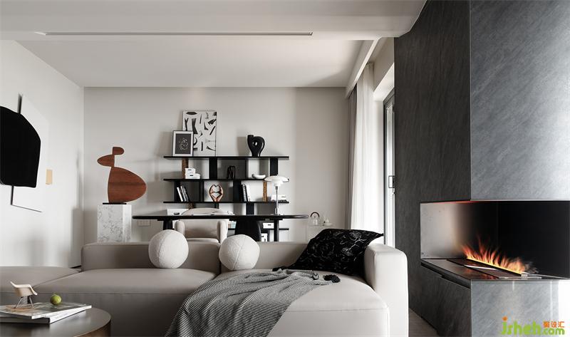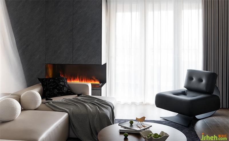 拆除書房墻體后,根據(jù)其位置靠墻打造了一個(gè)頂天立地的儲(chǔ)物柜,提供充足的儲(chǔ)物空間,柜門與同色系的背景墻融為一體,整體性更強(qiáng),空間更顯整潔利落。儲(chǔ)物柜與沙發(fā)扶手等高處留空,嵌入電子壁爐,為家?guī)頊剀芭狻?