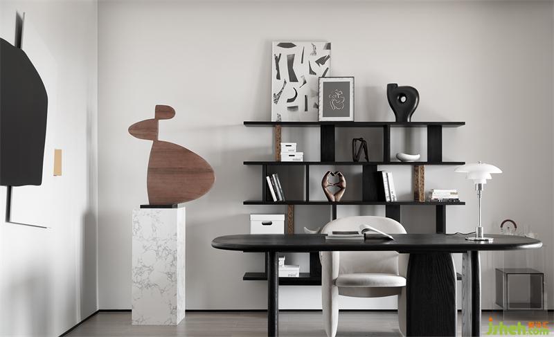 書房選用深色木質(zhì)書桌與書柜,打造出沉靜的空間感。簡約大氣的落地藝術(shù)擺件,結(jié)合大理石和木材的自然紋理走向,讓空間兼顧美觀性的同時(shí),植入安靜純粹的精神觀感。