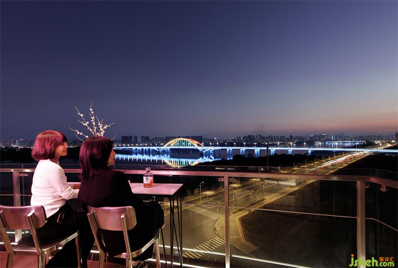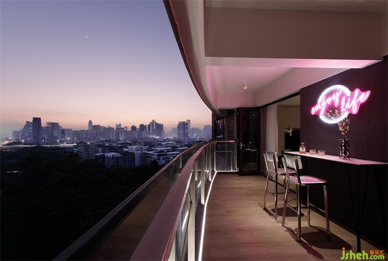 超長景觀陽臺(tái)上靠墻布置一張桌子,搭配彩色氛圍燈,陽臺(tái)瞬間變身情調(diào)吧臺(tái),打造出一方讓人享受片刻休閑的完美領(lǐng)域。