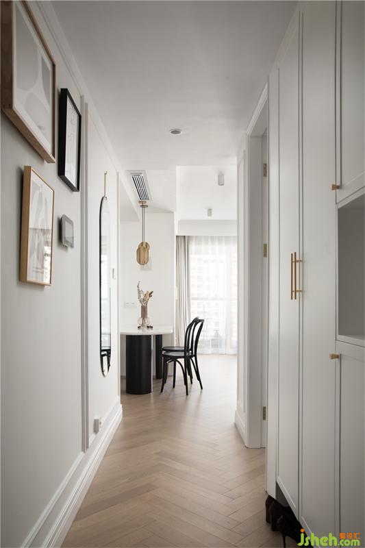 入戶左邊墻面PU線條框內(nèi),采用了一組藝術(shù)掛畫用來和對講機組合,法式裝修設(shè)計讓對講機隱藏與其中,配上一個橢圓的穿衣鏡,出門的時候整理著裝就變得方便很多,右邊是鞋柜和老人房的入戶暗門,每天進出都將經(jīng)過如此藝術(shù)的場景,也是一件很美好的事情。