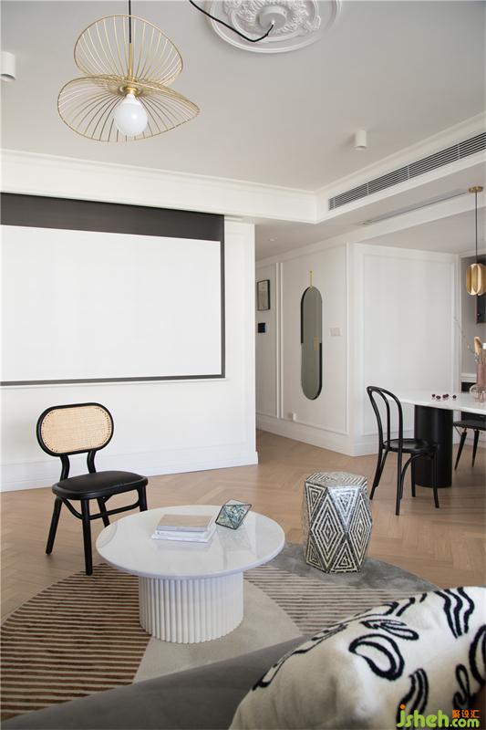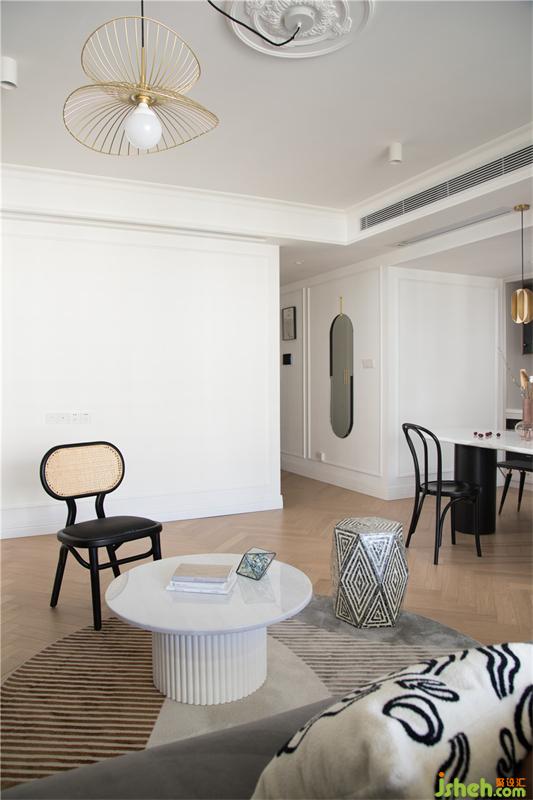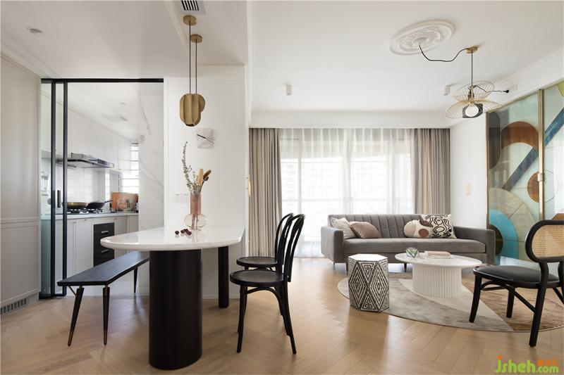 中廚和西廚之間通過兩扇玻璃聯(lián)動門隔開,平時不炒菜的時候可以打開,法式裝修設(shè)計空間視覺流線更順暢,考慮到西廚和餐廳之間的尺度不是很大,因此設(shè)計了的餐桌是長凳和有椅背的餐椅以及半圓形餐桌組合,側(cè)墻整面的收納柜,也解決了客廳所有的雜物收納。日常使用便利的同時也讓空間更加的開闊。