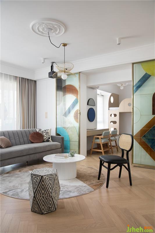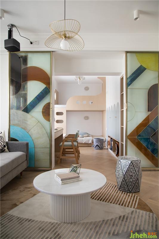 當彩色玻璃屏風門推開的時候,雙層結(jié)構(gòu)的小孩房便和客廳融為一體形成了最獨特的風景,而小朋友的活動范圍也更加寬敞,與大人也多了更多的互動。