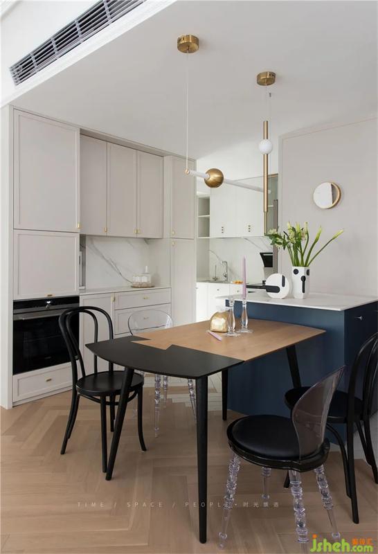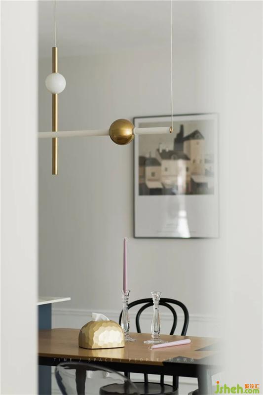 燕尾式拼接的餐桌和黑色的14號(hào)椅特別搭配,我們特意配了一張透明亞克力椅背的餐椅,減少椅子的存在感,增加空間的尺度感。