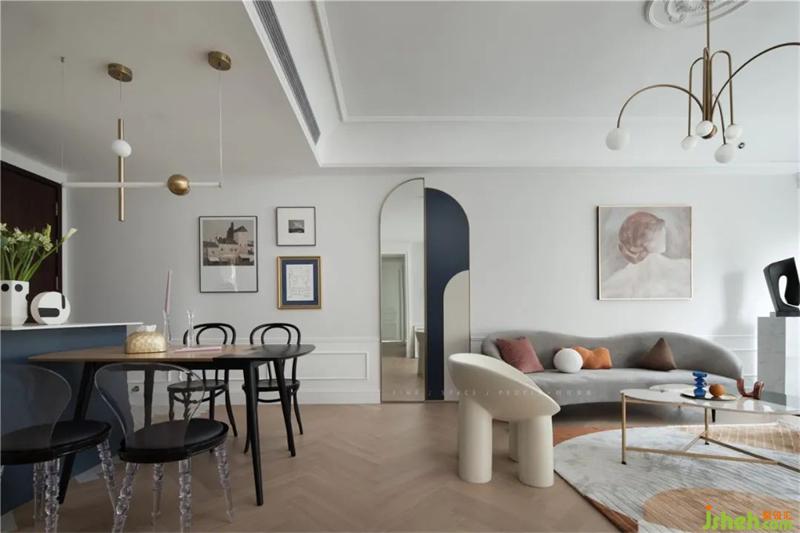 整面的沙發(fā)背景通過一個(gè)高低圓潤的原創(chuàng)屏風(fēng),法式家居設(shè)計(jì)將餐廳空間和客廳空間巧妙的區(qū)分開來,屏風(fēng)的局部鏡面設(shè)計(jì)讓屏風(fēng)顯得更加靈動(dòng),加強(qiáng)了走道空間的縱深感,當(dāng)女主人從主臥一打開門,就像走T臺(tái)秀一樣,看見最閃亮的自己。