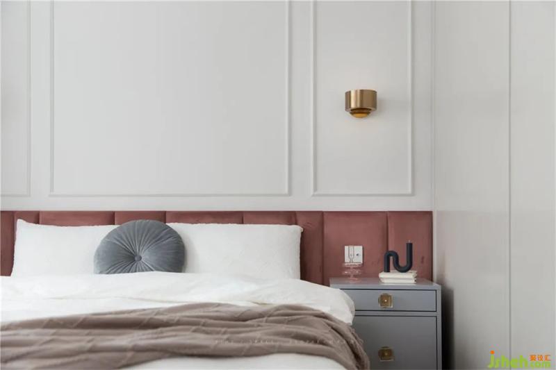 主臥用了一個(gè)偏暖棕色的臟粉色軟包做滿床頭,搭配不同的奶灰色,淺灰色,局部點(diǎn)綴金色,空間溫暖而精致。