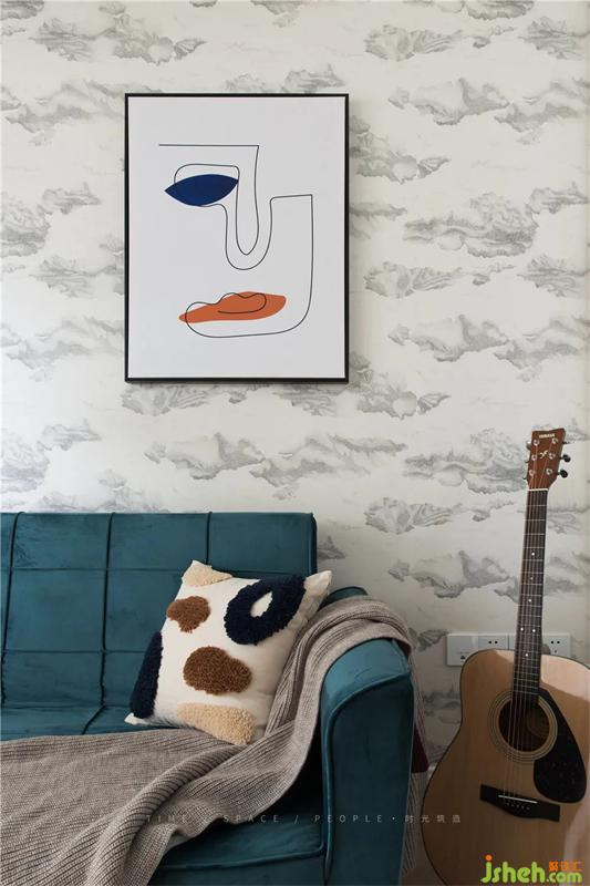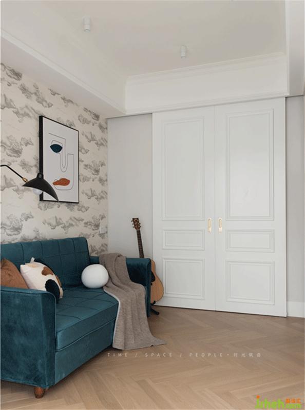 書房臨近過道的門是兩扇推拉的造型門,因?yàn)閮蛇吺菈?,所以希望打開的時(shí)候門也是一個(gè)裝飾,和墻面的墻紙,沙發(fā)能形成一個(gè)場景感。