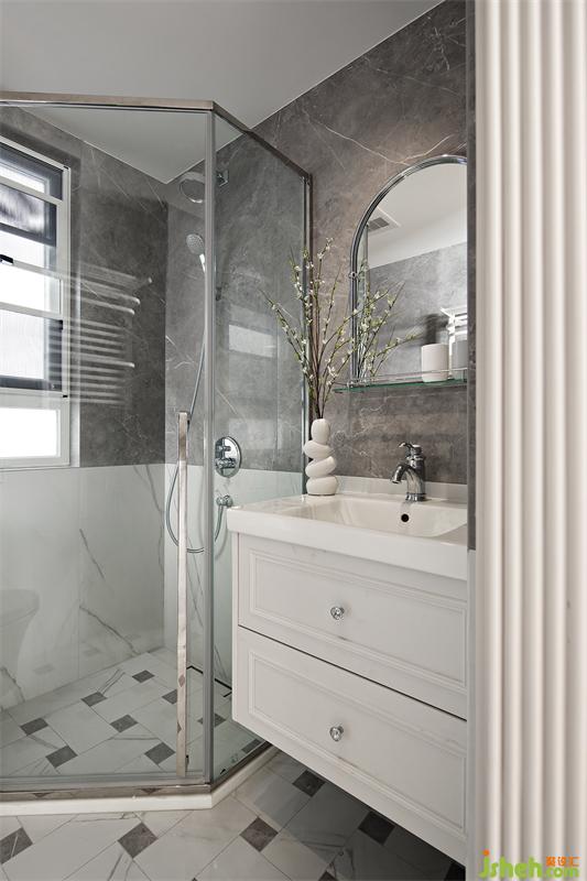 公衛(wèi)做了獨立的淋浴區(qū),整體采用黑白灰基色系,顏色淺淺柔柔的變化,法式藝術(shù)設(shè)計大理石拼花地面與大理石墻面相融相合,讓狹小的空間也能生動獨特的體現(xiàn)出層次美。