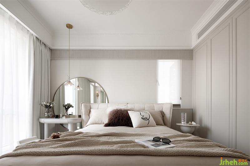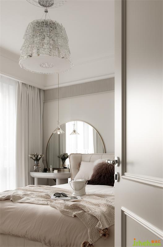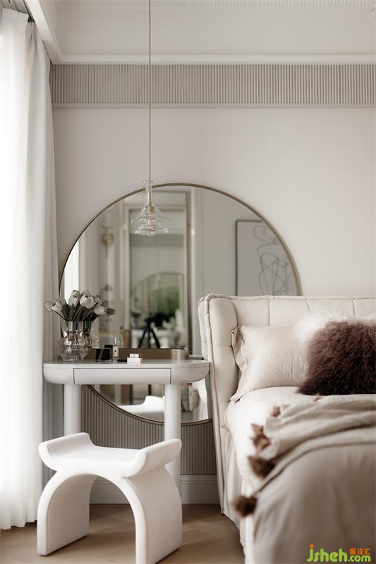 碎片形態(tài)的水晶吊燈,極具包圍感的大床,粉色的床品,圓潤的梳妝臺,獨具設(shè)計感的梳妝凳,心底的滿足感猶如綿密的泡沫升騰起來,充盈而豐富。