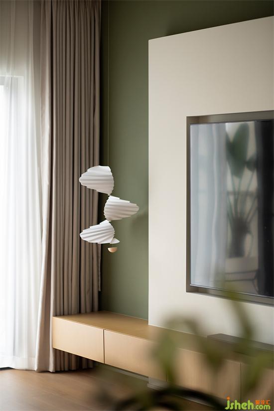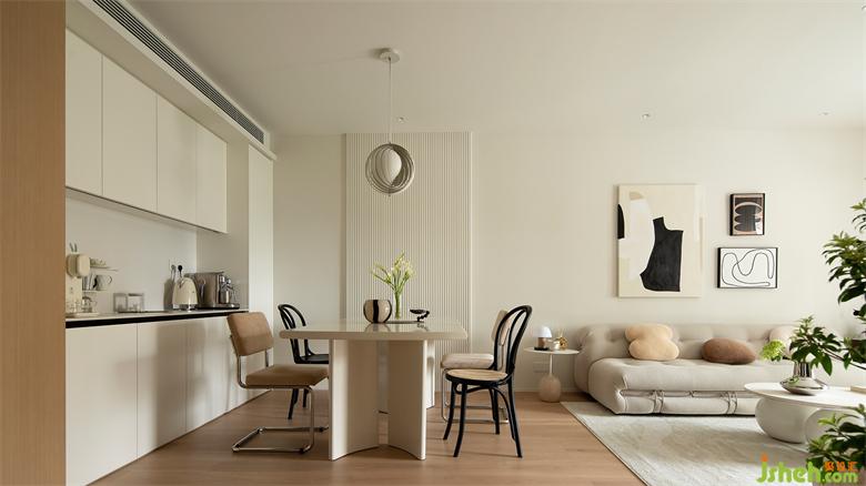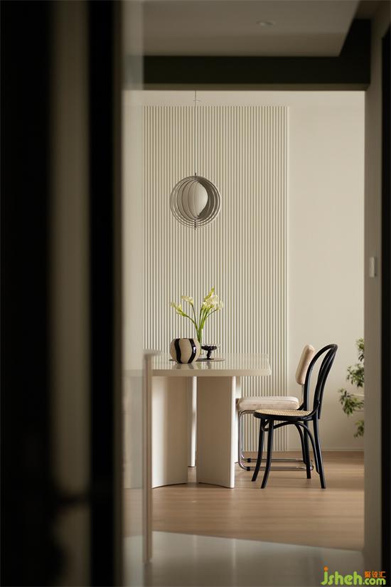 波浪板向上延伸,家裝設(shè)計(jì)吸引視線上移拉伸層高,輔以吊燈點(diǎn)綴,餐區(qū)作為走廊端景,美得像一副藝術(shù)畫作。