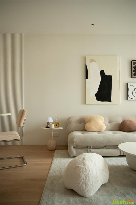 沙發(fā)、抱枕、地毯均為絨布質(zhì)感,親膚柔軟,符合整屋調(diào)性,家裝設(shè)計(jì)把家的溫馨舒適感展現(xiàn)淋漓盡致,這是奶油風(fēng)的基調(diào),也是家的真諦。