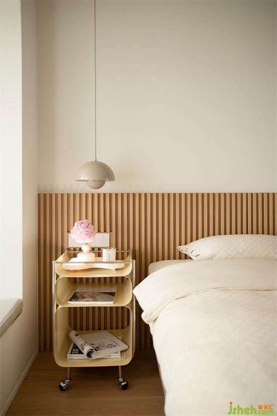 金屬質(zhì)感小推車代替笨重床頭柜。三層結(jié)構(gòu)有大有小,家裝設(shè)計滿足不同的收納需求,奶杏色花苞吊燈利落而下,點綴床頭溫馨氛圍。