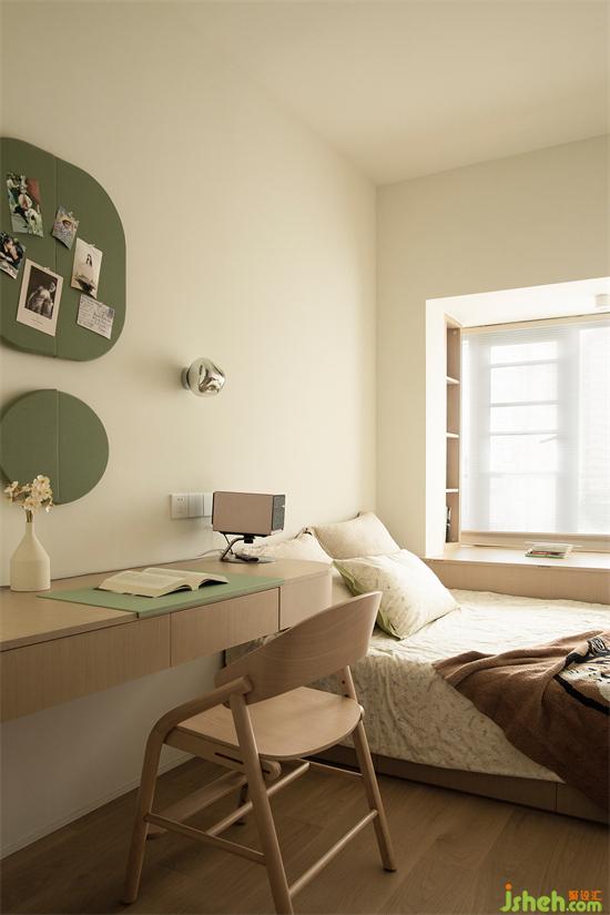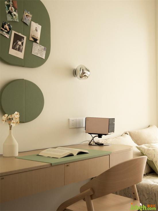 次臥連接陽臺,目前作為客房以及獨立書房使用,牛油果綠從公區(qū)蔓延至此,注入活潑氣息。