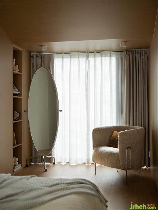 落地窗前擺放穿衣鏡和單人沙發(fā),家裝設(shè)計墻角設(shè)置收納柜以及開放格,作為開放式衣帽間,或是獨立閱讀區(qū),功能豐富,生活場景隨意變化。