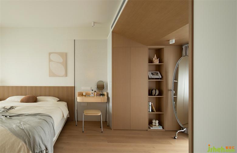延續(xù)公區(qū)奶油色調(diào),原木的暖黃感一直貫穿其中,去床頭設(shè)計簡潔大氣,半墻長城板圈出床頭區(qū)域,家裝設(shè)計擯棄繁雜設(shè)計,卻能夠依舊保持豐富質(zhì)感。