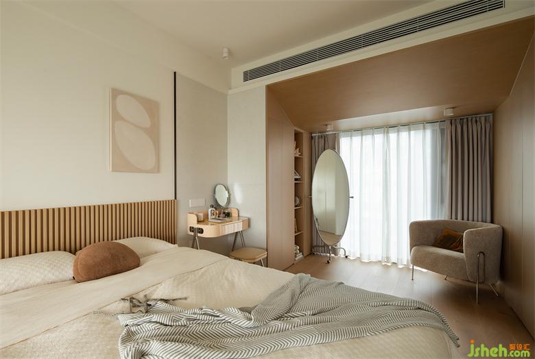 臥室另一邊屬于陽臺結(jié)構(gòu),木板上墻裝飾壁面,視覺上隱形異型結(jié)構(gòu),保持空間協(xié)調(diào)統(tǒng)一,更加美觀大氣。