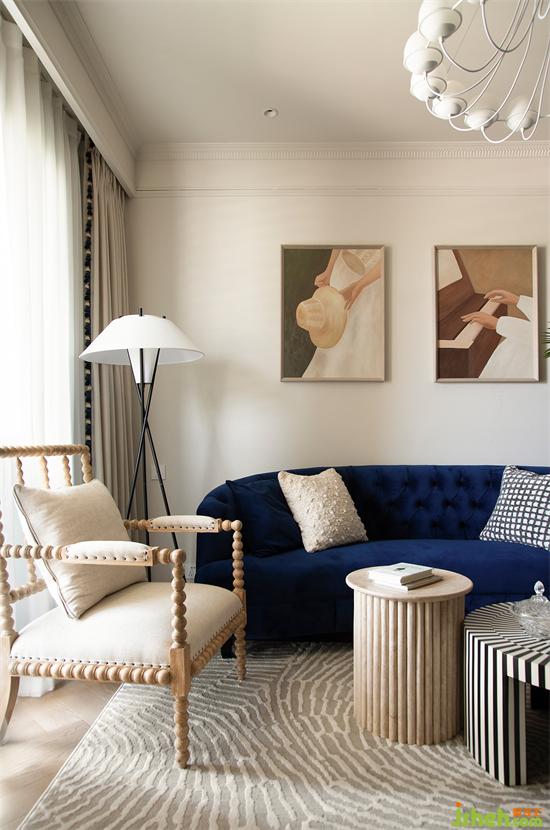 藍色絲絨沙發(fā),靠背采用拉扣設(shè)計,法式度假風(fēng)設(shè)計注入滿滿歐式風(fēng)情,茶幾、地毯、單人座椅以及裝飾畫,這些軟裝富含濃厚的摩洛哥元素,異域風(fēng)情讓整屋風(fēng)格更加多元化。