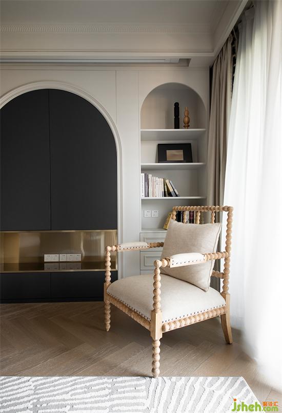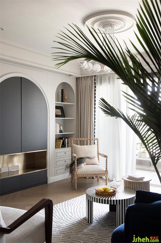 客廳不設(shè)電視,石膏線條包裹的拱形中嵌入收納柜,模仿法式壁爐的形狀,下方用黃銅金屬打造開放格,獨特的造型下,法式度假風(fēng)設(shè)計卻能滿足不同的收納需求,顏值與使用二者兼得。