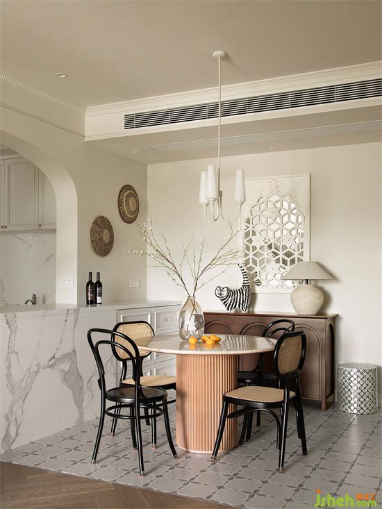 法式度假風(fēng)設(shè)計在優(yōu)雅精致的小花磚中展開餐廳序幕,圓形小巧餐桌搭配仿羅馬柱桌腿,刻畫一片藝術(shù)感滿滿的用餐區(qū)域。