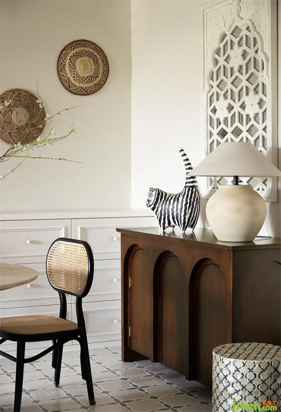 深色木材打造的餐邊柜增添了一絲中古氣息,法式度假風(fēng)設(shè)計(jì)搭配墻面的做舊感鏤空掛飾,時(shí)光仿佛穿梭回上個(gè)世紀(jì),為法式風(fēng)注入復(fù)古沉穩(wěn)的調(diào)性,提升整屋質(zhì)感。