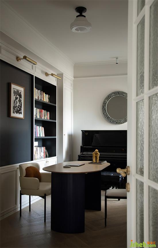 推開門來到獨(dú)立的書房區(qū)域,弧形書桌與餐桌相得益彰,背景墻采用白色石膏線板收納柜搭配黑色開放格,法式度假風(fēng)設(shè)計(jì)裝飾墻面的同時(shí),滿足書房的收納需求,上方安裝黃銅金屬壁燈,讓精致氛圍落實(shí)在每個(gè)細(xì)節(jié)。