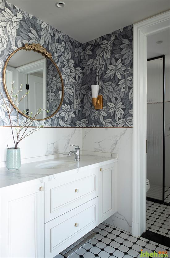 公衛(wèi)采用開(kāi)放式設(shè)計(jì),法式度假風(fēng)設(shè)計(jì)將洗漱臺(tái)外移形成三分離衛(wèi)浴空間,賦予更多的功能性。巖板與壁紙裝飾墻面,黃銅金屬鑲邊的浴室鏡、燭臺(tái)狀壁燈,精致且浪漫包裹住洗漱區(qū)域。