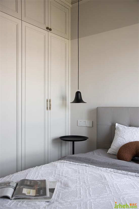 黑色鈴鐺狀吊燈搭配同色邊幾,線條簡(jiǎn)約利落,呼應(yīng)衣柜柜門上的石膏線條,清爽的法式感不言而喻。