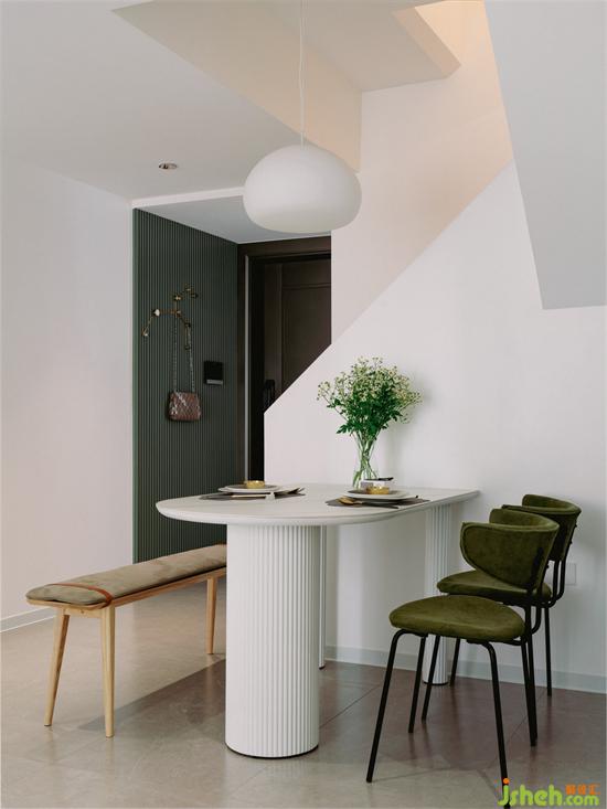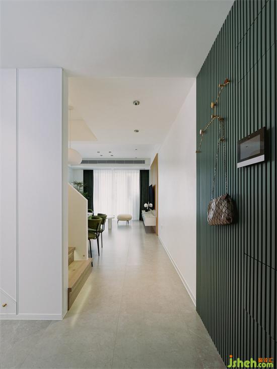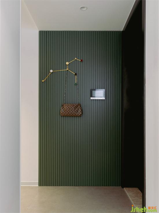墨綠色的墻面將玄關(guān)和室內(nèi)空間分割開來,讓入戶有了緩沖和過渡,從而增加回家的儀式感。