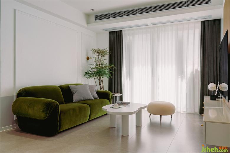 客廳和陽臺用了一個玻璃門隔開,白色紗簾與墨綠色窗簾的組合,能夠在保證隱私的同時最大限度的引入自然采光。