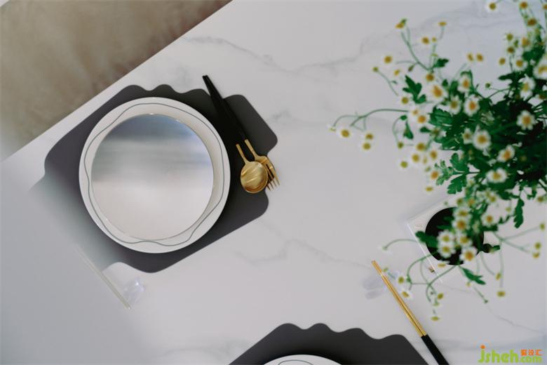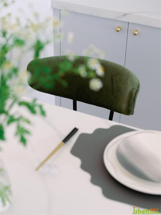 白色大理石紋的巖板餐桌,配上兩把墨綠色絲絨餐椅,再擺上精致的餐具和生機勃勃的花束的花束,大氣又不失活力。