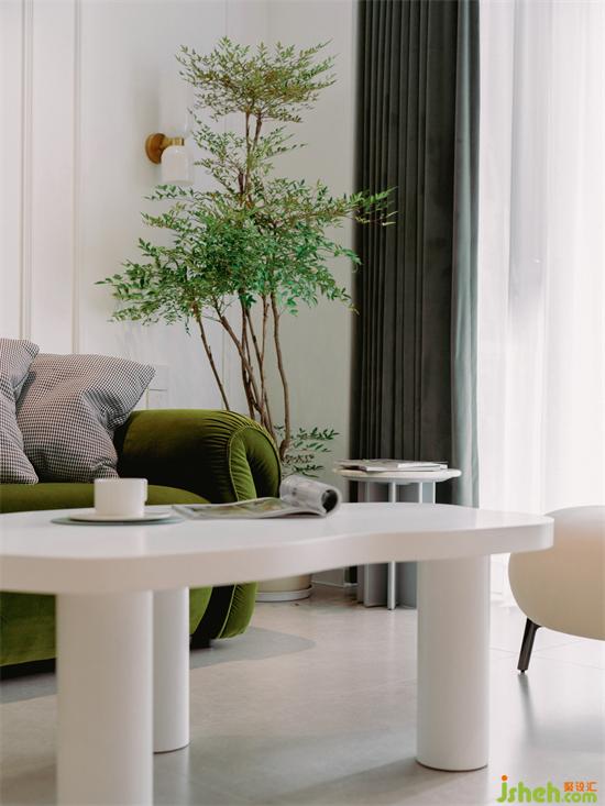 客廳以墨綠色絲絨沙發(fā)為主角,跳躍的綠色占據(jù)了客廳的視覺中心,家裝設計并與一側(cè)同色系的窗簾、落地綠植交相呼應,為空間營造出清新舒適的居家氛圍。