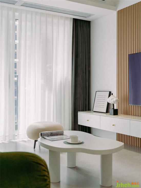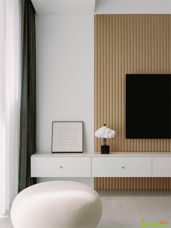 客廳電視背景墻用優(yōu)雅的淺咖色長城板營造空間秩序感,搭配白色的懸空電視柜,家裝設計讓空間變得靈動有層次。