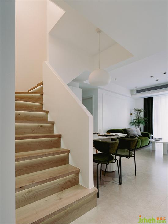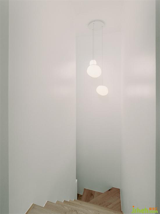 垂然而下的吊燈,搭配白色墻面與木質(zhì)臺階,讓狹窄的樓梯間更顯敞亮舒適。