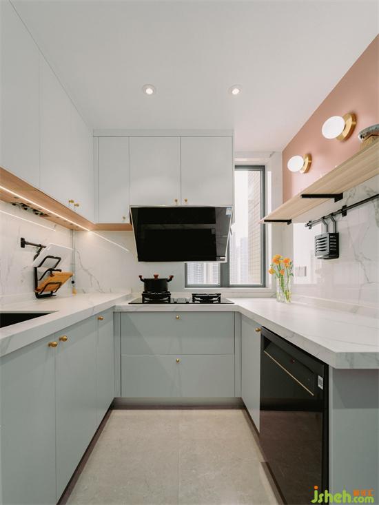 U型廚房布局,實現(xiàn)空間的最大化利用,白色吊柜+淺藍色的櫥柜組合,加上大理石紋臺面,與客廳沙發(fā)背景墻的配色保持一致,顯得精致又優(yōu)雅。