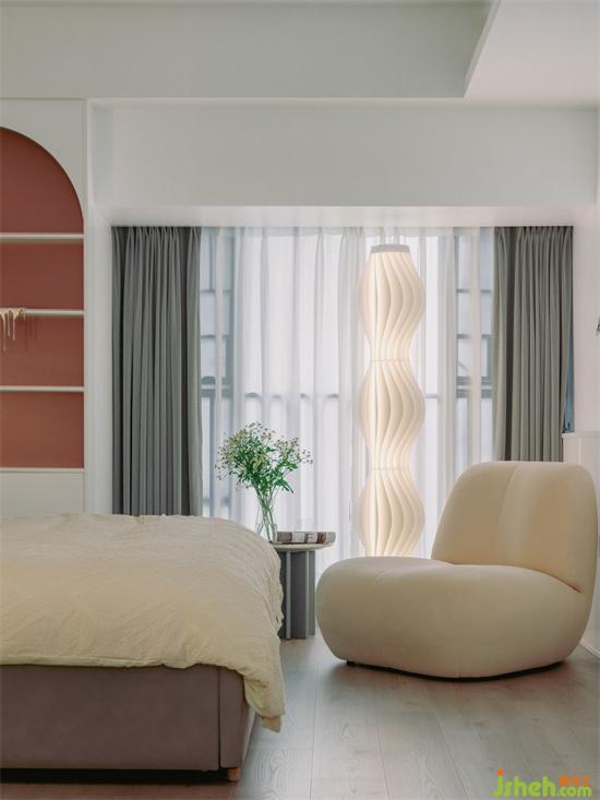 整面落地窗為臥室一角增添了休閑功能,柔軟的奶茶裸色懶人沙發(fā),將美感與舒適融于其中,散發(fā)出一種甜美復(fù)古的奶油感。家裝設(shè)計一旁的落地燈發(fā)出柔和舒適的光線,為空間更添一份溫馨。