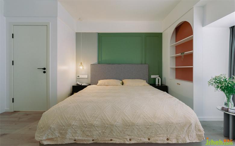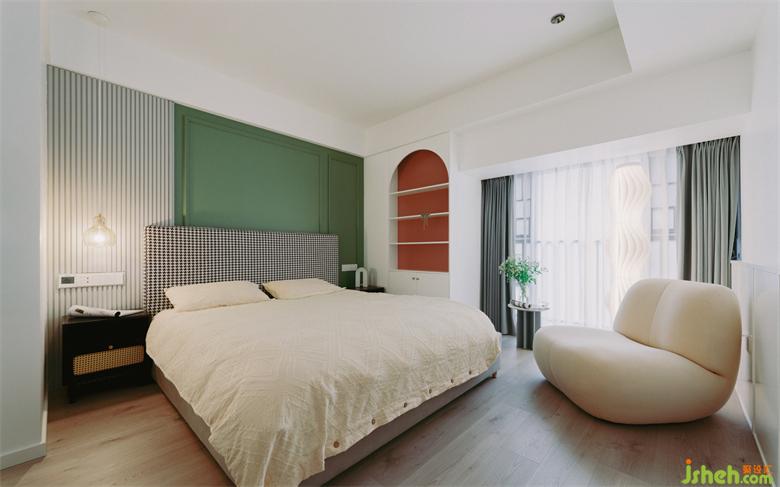 主臥以大面積的精致白色作為底色,加入復(fù)古綠與明亮的愛馬仕橙點綴,調(diào)和出靜謐又不失活力的空間氛圍。